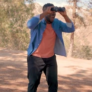 Emmanuel is a teacher who wears a light blue jacket, a salmon-colored shirt, gray pants, and multicolored socks.