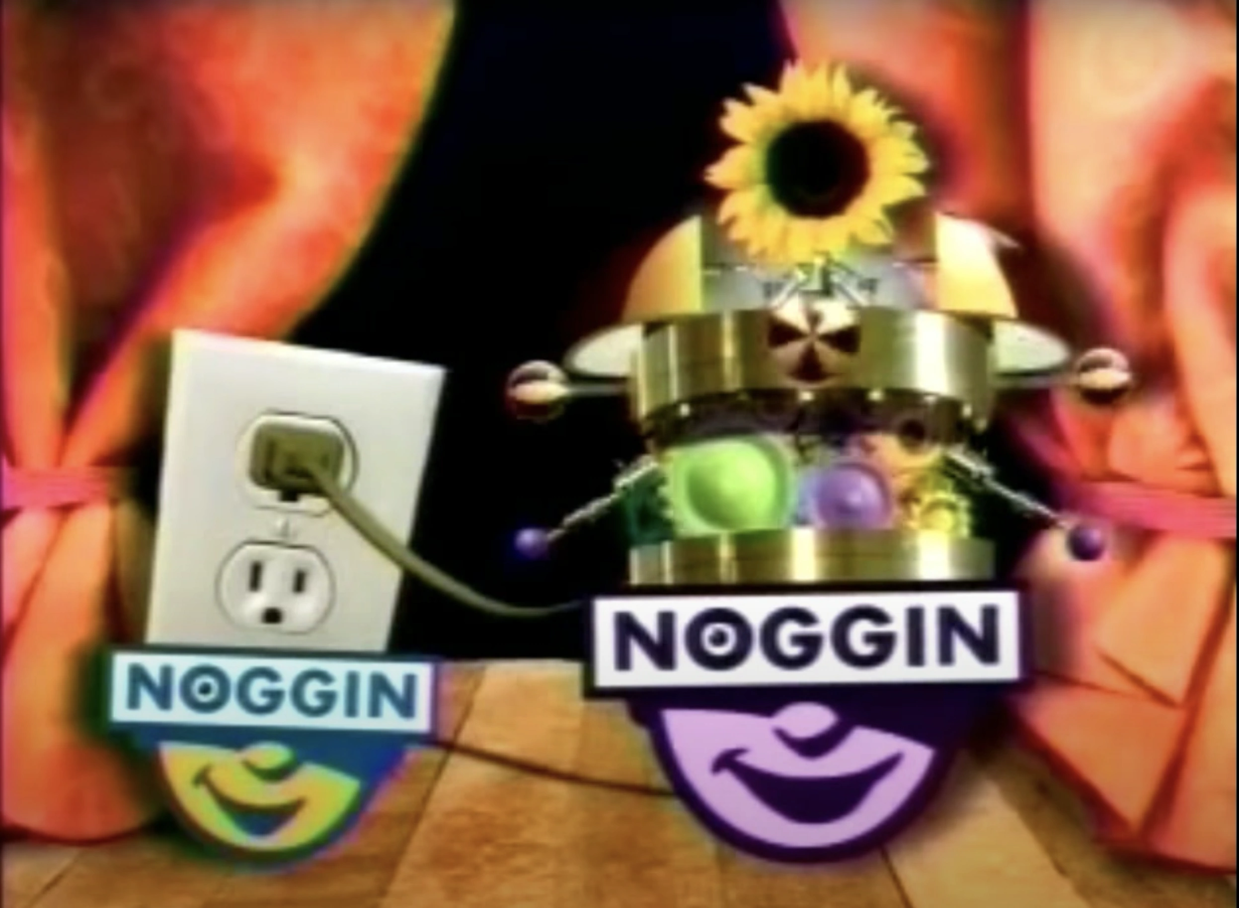 A Robot in the Noggin logo puts together the letters in Noggin to form the banner, then blasts off.